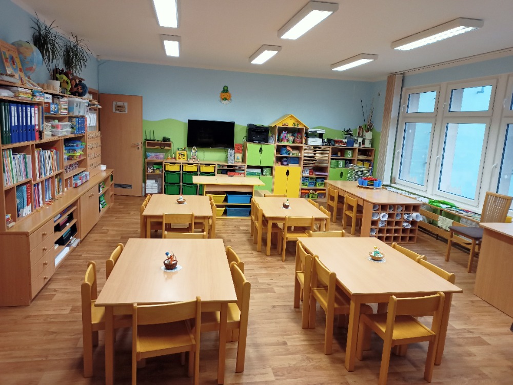 Prostor třídy je rozdělený na 2 větší části. 1 s kobercem, kde mají děti místo k relaxaci a chvilkám s knížkou, větší stavebnice, auta, kočárky s panenkami a hrací koutky – kadeřnictví, kuchyňku, obchod a ordinaci. Druhá část se stolečky slouží dětem převážně k výtvarným a pracovním činnostem, k hraní stolních her, skládání puzzle, tvořením ze stavebnic, hře s domečky a herními sestavami s drobnými doplňky .….. Také se zde děti schází ke společnému stolování. Další, samostatnou částí třídy, je místnost, kterou dopoledne využíváme k pohybovým činnostem, k řízeným společným aktivitám a k odpočinku po obědě.