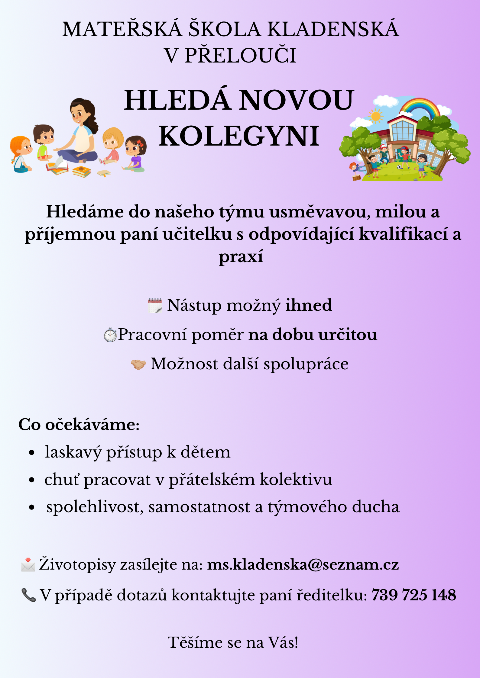 53501 Přelouč, Kladenská 1332, IČO 48160903, tel. 466 768 280, mail: ms.kladenska@seznam.cz